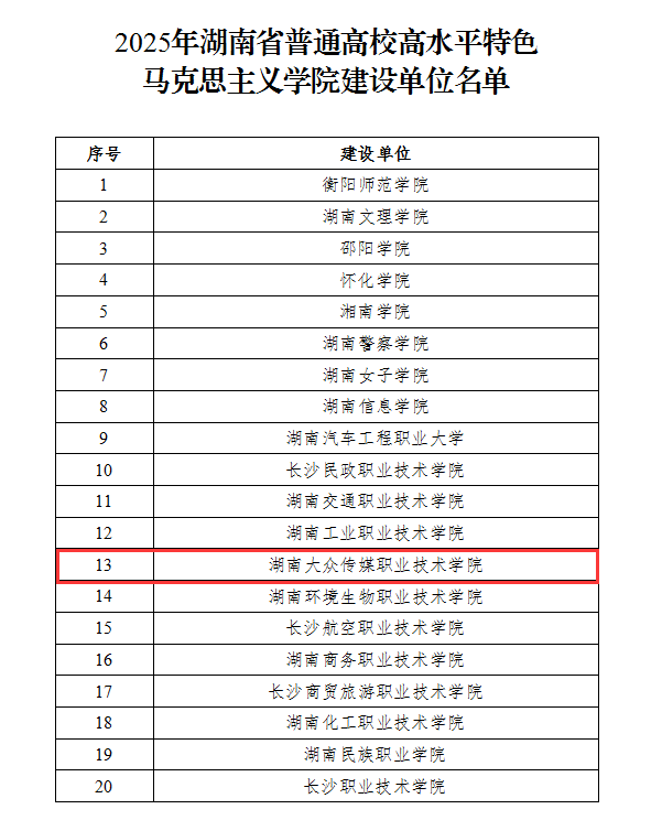 近日,中共湖南省委教育工委、湖南省教育厅正式发布《关于公布2025年湖南省普通高校高水平特色马克思主义学院建设单位的通知》,共遴选出20个高水平特色马克思主义学院建设单位(其中本科高校8所,高职院校12所)。我校马克思主义学院成功入选,成为本次获批建设的单位之一。